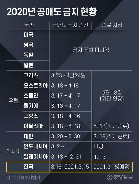 위에 표를 참고하여 단편적으로 생각한다면, 우리나라만 공매도 금지를 유지한다고 생각할 수 있지만, 국가별로 제도나 규정이 다릅니다.